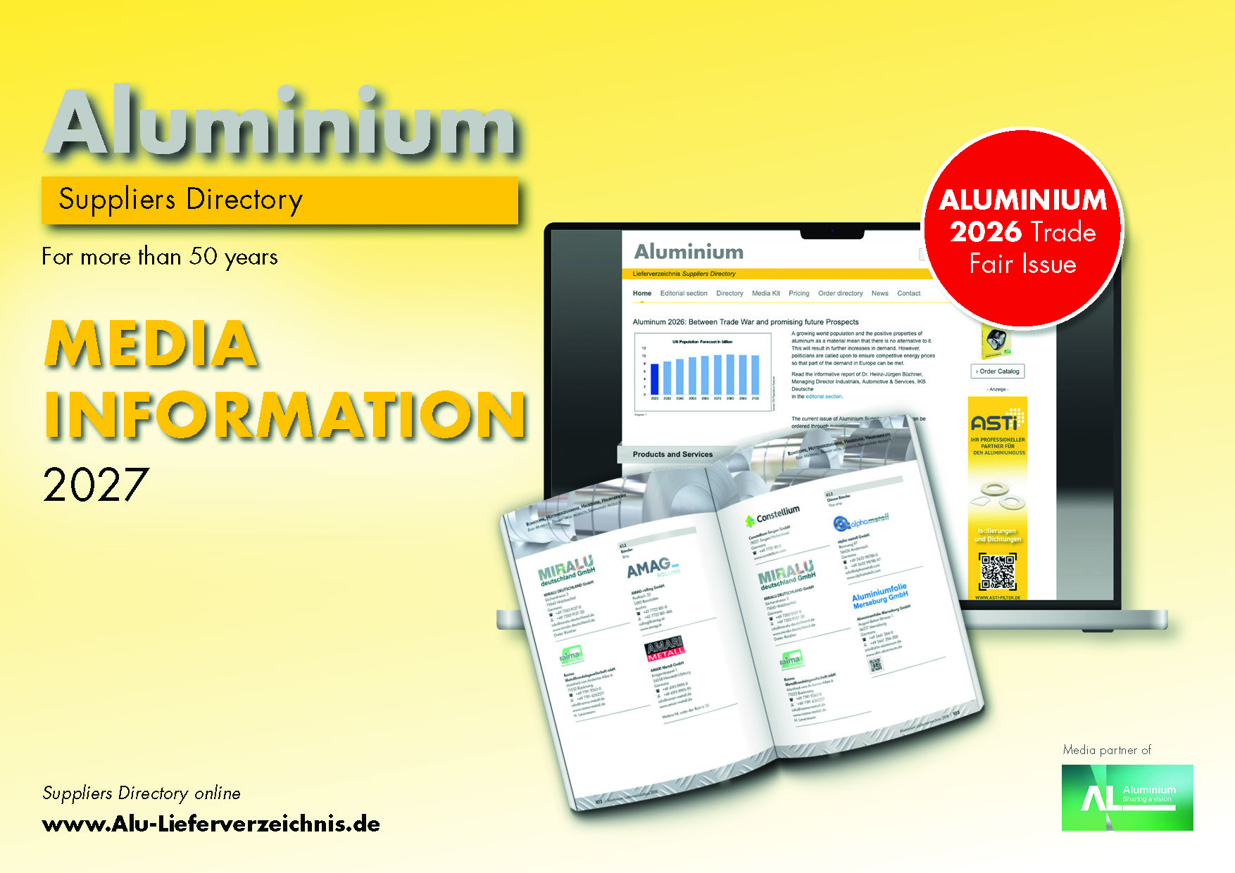 The Aluminium Suppliers Directory’s Media Kit is also available for download as a PDF file. Adobe Acrobat Reader or compatible software is required to read the file.